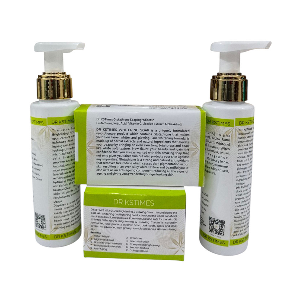 Achieve radiant youthful and protected skin with the Dr Kstimes Vita Glow Glutathione Whitening Soap | SPF 50 Sunscreen Lotion | Face Wash| Skin Brightening Night Cream – a complete daily skincare solution for a brighter clearer and healthier complexion. This combo includes: Vita Glow Skin Whitening Face Cream (30g) – Intense nourishment & overnight skin brightening. Vita Glow Glutathione Whitening Soap (75g) – Deep cleansing & skin renewal. Vita Glow SPF 50 Sunscreen Lotion (100ml) – Long-lasting UV protection & hydration. Vita Glow Skin Whitening Face Wash (100ml) – Gentle cleansing & oil control Formulated with: Glutathione, Collagen Peptide, Alpha Arbutin, Beta Arbutin, Niacinamide, Vitamin C, Vitamin E and natural botanical extracts this powerful skincare combo targets dark spots hyperpigmentation uneven tone dryness and sun damage while keeping your skin hydrated smooth and protected all day.